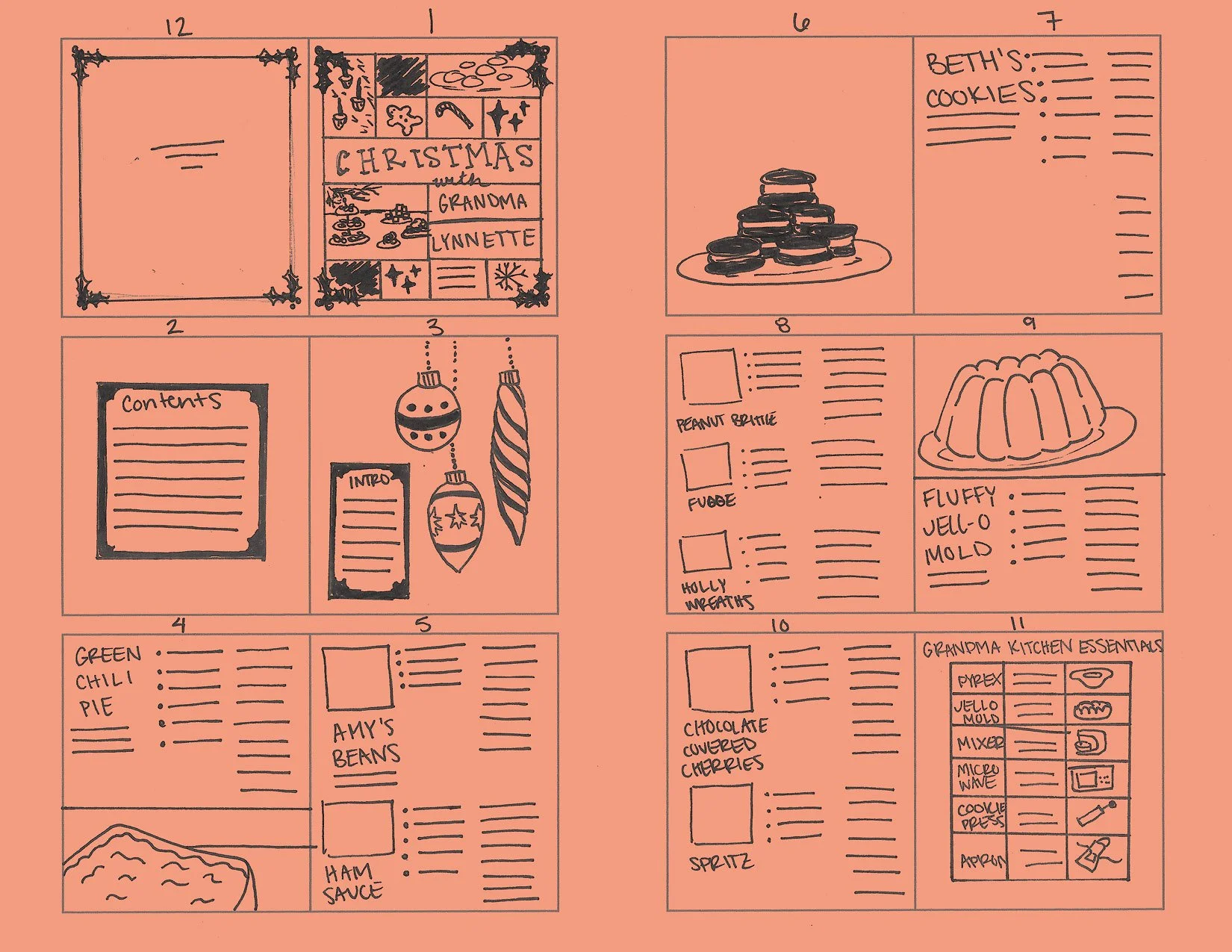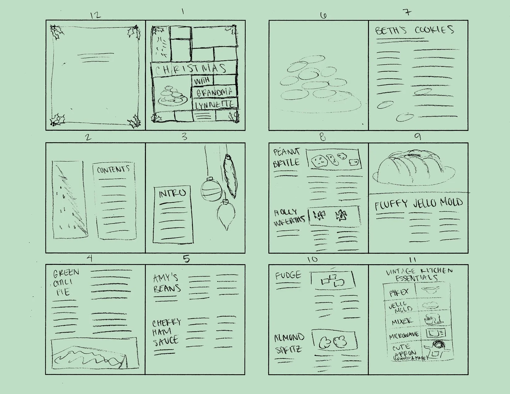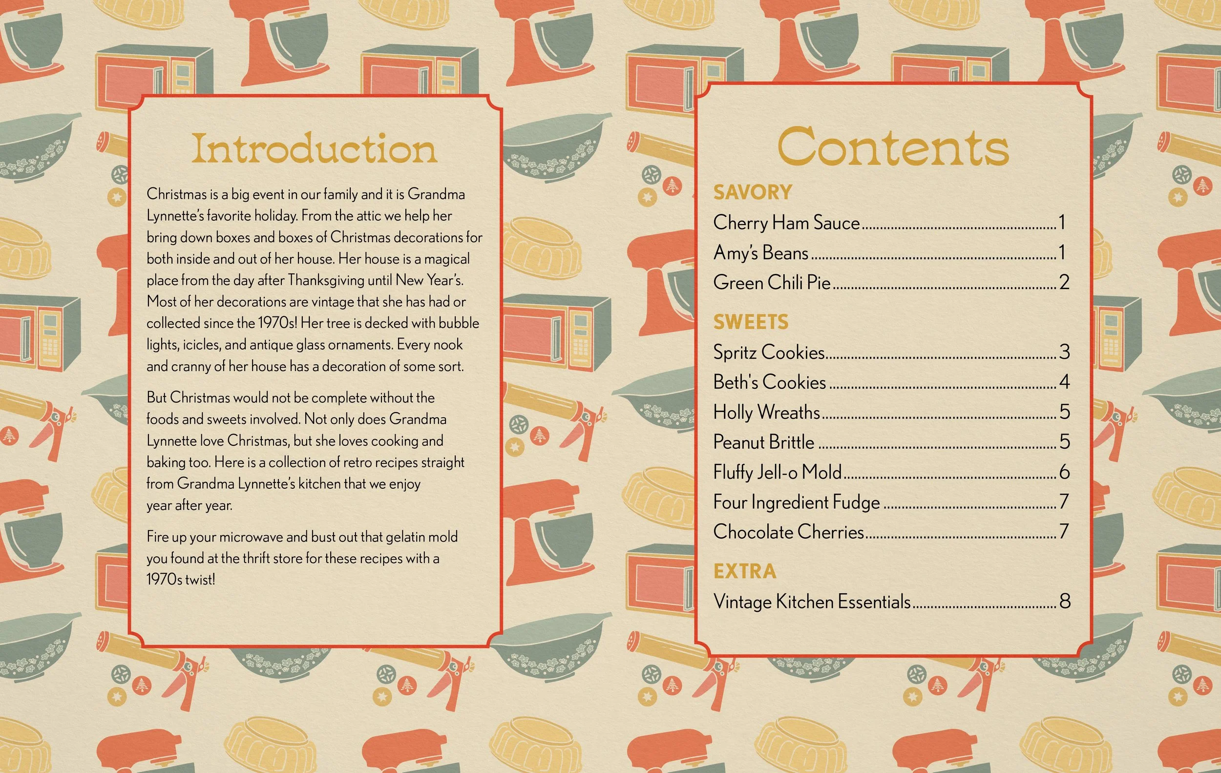 Christmas with Grandma Lynnette is a collection of recipes straight from my grandma’s kitchen that we enjoy year after year at Christmastime. This recipe book captures the retro homemade charm of my grandma’s kitchen and recipes through the use of a softer (maybe a lil dingy like a vintage couch) Christmas color palette, festive typography, and hand-drawn vector illustrations.